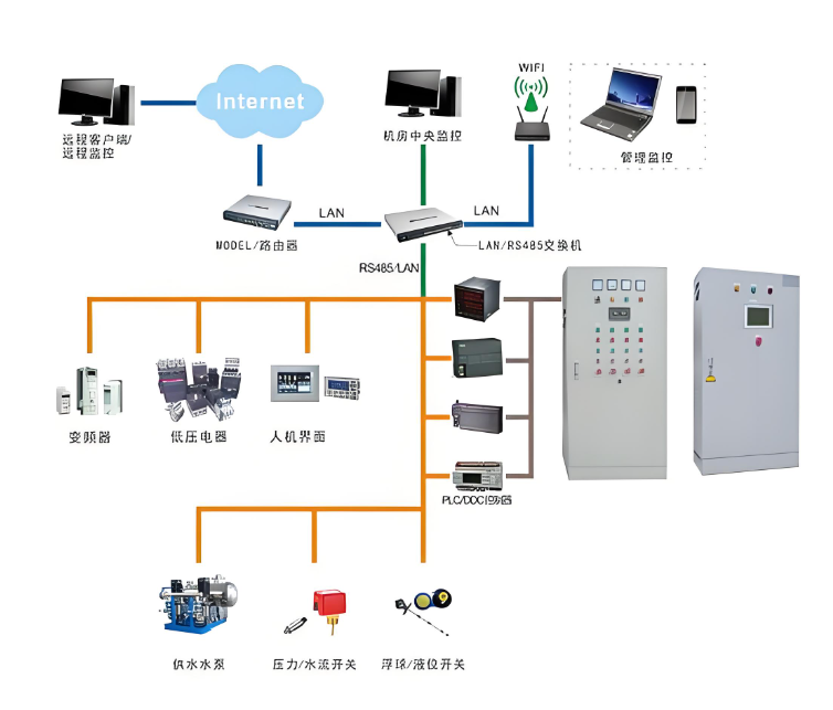 供水设备是为解决由于压力不足,无法到达用户用水的高度或流量,而专门研发设计的新型环保节能的专业设备。供水设备可分以下几种,水箱供水设备,无塔供水设备,消防供水设备,变频恒压供水设备,通过该系统可实现对水泵的开停、主排水管路的流量、水泵排水管的压力、水仓的水位等信号的实时监测,并能通过该系统实现三台主水泵的自动、手动控制并和PLC监控系统的联网运营,实现地面监控。